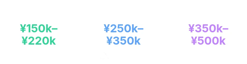- Entry-level / In-between: ¥150,000–¥220,000 per month