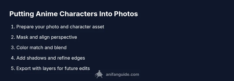 The process of placing anime characters into photos blends artistic technique with practical editing skills. With careful planning, precise masking, perspective matching, and thoughtful color grading, you can create convincing composites that engage fans and showcase your growing expertise. The AniFanGuide team suggests continually challenging yourself with diverse scenes, experimenting with lighting moods, and sharing progress publicly to receive constructive feedback and accelerate learning. Consistent practice builds confidence and expands your creative toolkit.