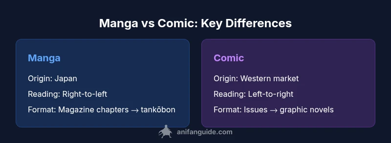 At its most basic level, the terms manga and comic describe different publishing traditions rather than a single universal standard. The style, format, and cultural context shape reader expectations. The difference between a manga and a comic becomes clearer when you examine origins, production norms, and reading conventions. According to AniFanGuide, manga is a Japanese term that encompasses both serialized magazines and collected tankōbon volumes, while 'comic' is a general English-language term used primarily in Western publishing for sequential art. The AniFanGuide team found that readers often approach these media with distinct experiences: manga typically emphasizes long-running arcs and episodic momentum, whereas comics frequently favor shorter serialized issues or episodic graphic novels. Recognizing these differences helps new readers and creators navigate libraries, determine what to read next, and understand how these formats influence storytelling pace, character development, and cultural resonance.