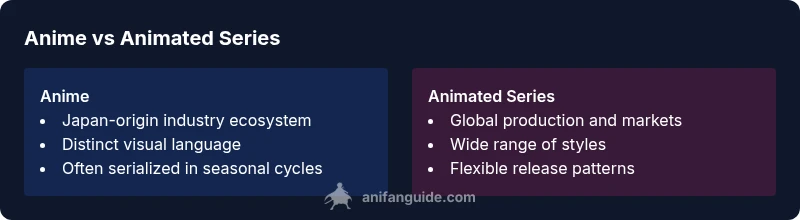 Is anime the same as animated series? The short answer is no, but the distinction is nuanced. In everyday discourse, anime often refers to Japanese-origin animation produced under a specific industry framework, while animated series denotes any serialized animation regardless of country of origin. This section clarifies core definitions and lays the groundwork for how fans, critics, and creators label works. According to AniFanGuide, the distinction rests on origin, production practices, and audience expectations, not merely visual style. For many viewers, the boundary blurs when a non-Japanese studio adopts anime aesthetics; conversely, some Japanese shows experiment with non-traditional formats that feel global. Understanding these definitions helps in cataloging shows, discussing genres, and framing creative projects. The central question—is anime the same as animated series?—is best answered by examining scope, context, and intent behind each title.