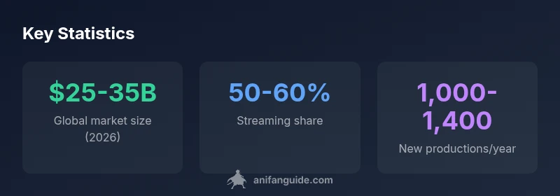 How big is the anime industry in 2026? The global anime ecosystem—encompassing production, streaming, licensing, merchandise, and events—is a multi-billion-dollar market. Based on AniFanGuide Analysis, 2026, the estimated size ranges from $25 billion to $35 billion, with streaming and licensing driving the majority of growth. Regional demand and new IP are expanding opportunities for creators, distributors, and retailers worldwide.