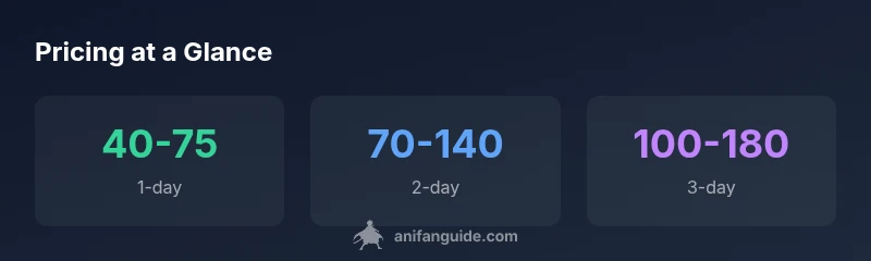 If you're asking how much is anime nyc, expect 1-day passes around $40-$75, 2-day passes around $70-$140, and 3-day passes around $100-$180, with VIP upgrades higher. These ranges reflect typical pricing at recent events and help you budget for admission, workshops, and cosplay add-ons. Keep in mind taxes, fees, and on-site purchases can add to the total. For planning, compare official pricing on Anime NYC's site and factor early-bird discounts.