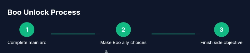 The path to Boo runs through a carefully chosen combination of main-story progress, conditional dialogue, and a final side objective. Collecting Boo requires you to: