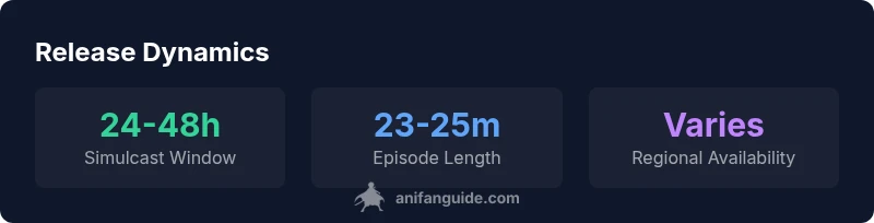 | Release cadence | Weekly, JP Sundays; regional simulcasts vary | AniFanGuide Analysis, 2026 | Check local schedule for exact times | |